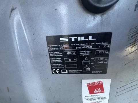 Elektryczne 4-kołowe Still RX60-50/600 2014 używane Elektryczny 4990 kg 4780 mm 600 mm 2500 mm 11093 h 516990E00081 FEM 3A 150x50x2400 Zinkenverstellgerät Kaup kwasowo-ołowiowy
