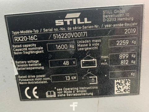 Elektryczne 3-kołowe Still RX20-16C 2019 używane Elektryczny 1600 kg 3300 mm 500 mm 2160 mm 9934 h 516220V00171 FEM2A Gurtbügelsystem kwasowo-ołowiowy