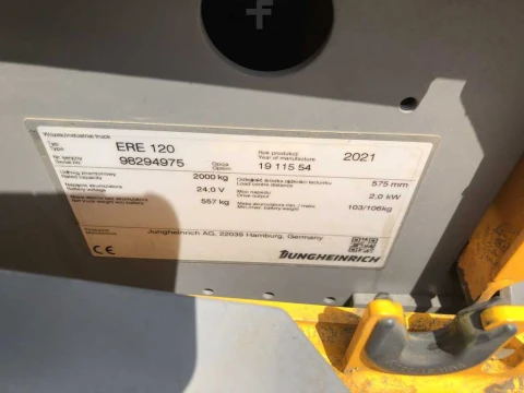 Wózki niskiego podnoszenia Jungheinrich ERE 120 FP 115-54 2021 używane Elektryczny 2000 kg 0 mm 600 mm 1300 mm 6906 h 98294975 1150 litowo-jonowy
