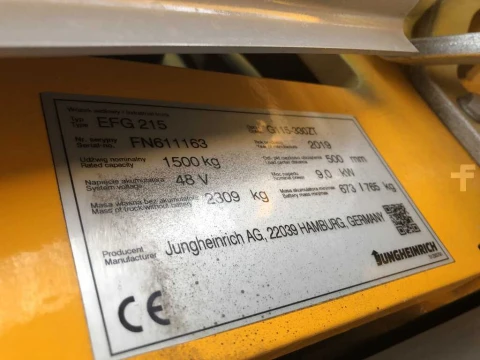 Elektryczne 3-kołowe Jungheinrich EFG 215 2019 używane litowo-jonowy 1500 kg 3300 mm 500 mm 2150 mm 7071 h FN611163 FEM2A 1150 litowo-jonowy