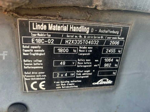 Elektryczne 4-kołowe Linde E 18C-02 Baureihe 335 Triplexmast 2006 używane Elektryczny 1800 kg 4200 mm 500 mm 2100 mm 6954 h H2X335T04032 1040 mm, ISO Klasse: ISO Klasse 2