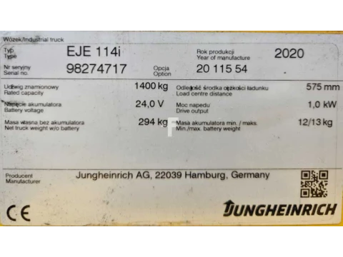 Wózki niskiego podnoszenia Jungheinrich EJE 114i Li-Ion Lithium 2020 używane Elektryczny 1400 kg 200 mm 600 mm 0 mm 5702 h 98274717 litowo-jonowy