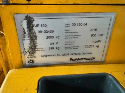 Wózki niskiego podnoszenia Jungheinrich EJE 120 2015 używane Elektryczny 2000 kg 200 mm 600 mm 1320 mm 4575 h 98133439 1150 mm kwasowo-ołowiowy