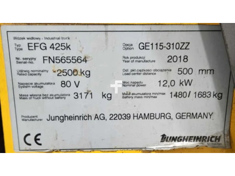 Elektryczne 4-kołowe Jungheinrich EFG 425k 4v/ 5295mh/ free lift 2018 używane Elektryczny 2500 kg 3100 mm 500 mm 0 mm 5295 h FN565564 nieznany
