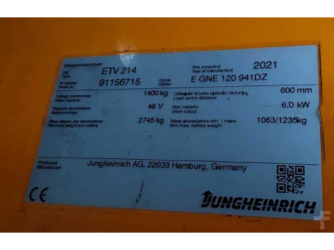Reach Truck Jungheinrich ETV 214 9.41m 2021 używane Elektryczny 1400 kg 9410 mm 0 mm 3670 mm 9475 h 91156715 nieznany