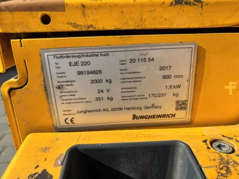 Wózki niskiego podnoszenia Jungheinrich EJE 120 2018 używane Elektryczny 2000 kg 220 mm 600 mm 1300 mm 2586 h 98194628 1150 mm kwasowo-ołowiowy