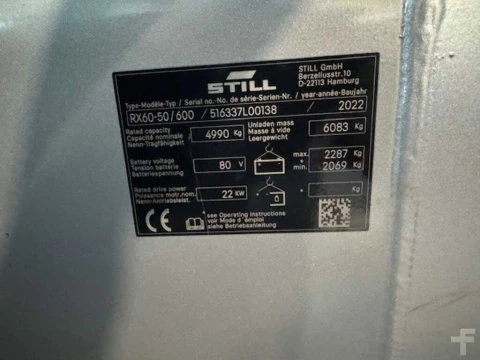 Elektryczne 4-kołowe Still RX60-50/600 2022 używane Elektryczny 5000 kg 4780 mm 600 mm 2500 mm 5409 h 516337L00138 2400 mm Bluespot hinten, Sonnenschutzrollo kwasowo-ołowiowy