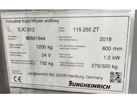 Wózek wysokiego podnoszenia Jungheinrich EJC 212 2018 używane Elektryczny 1200 kg 2500 mm 600 mm 0 mm 3562 h 60561644 nieznany