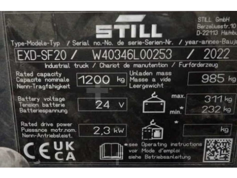 Wózek wysokiego podnoszenia Still EXDSF20 2022 używane Elektryczny 2000 kg 2024 mm 0 mm 1540 mm 7050 h W40346L00253 1190