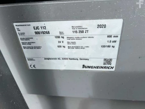 Wózek wysokiego podnoszenia Jungheinrich EJC112 Li-ion 2.5m/ 337mh 2020 używane Elektryczny 1200 kg 2500 mm 0 mm 1750 mm 337 h 90619268 litowo-jonowy