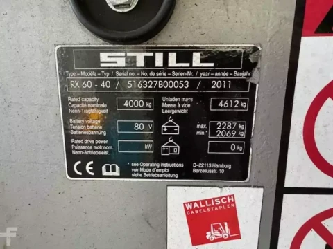Elektryczne 4-kołowe Still RX 60-40 2011 używane Elektryczny 4000 kg 5760 mm 500 mm 2780 mm 8016 h 516327B00053 Bluespot vorne + hinten; Scheibenwischer hinten; RAVAS-Waage kwasowo-ołowiowy
