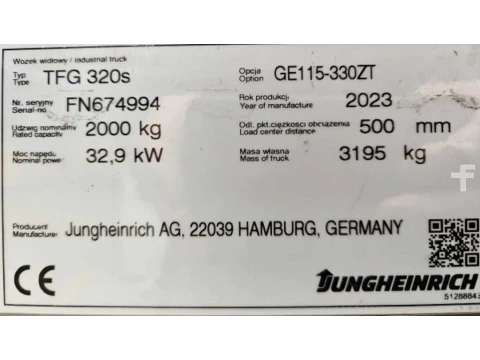 Wózki gazowe Jungheinrich TFG 320s SP GE 115-330 ZT 2023 używane Gaz LPG 2000 kg 3300 mm 500 mm 0 mm 1529 h FN674994 nieznany