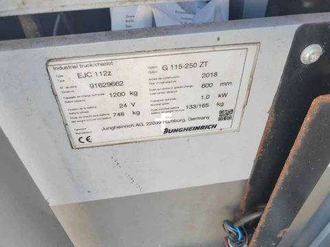 Wózek wysokiego podnoszenia Jungheinrich EJC 112z/ remote control/ acid protect/ initial/ 511h 2018 używane Elektryczny 1200 kg 2500 mm 0 mm 0 mm 511 h FORKS ACID PROTECTION COVER, REMOTE CONTROL, INITIAL LIFT nieznany