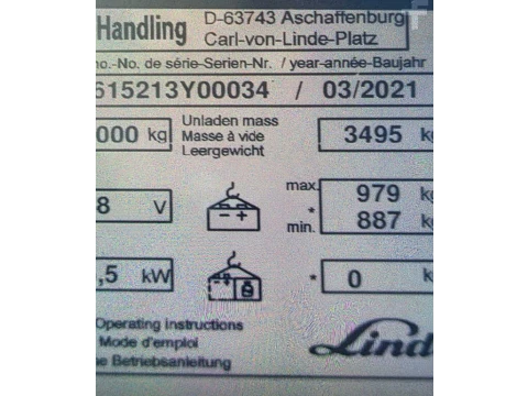 Wózki do komisjonowania pionowego Linde V 48 (5213) (drei Stück vorhanden) 2021 używane Elektryczny 1000 kg 7160 mm 0 mm 3900 mm 237 h 1150x120x60 mm LED Kabinenbeleuchtung, Vorbereitung 24Volt Terminal, Führung: mechanische ZF"D", Anfahr-R D50,b6=920-2000 mm Berührungslose Gangerkennung kwasowo-ołowiowy