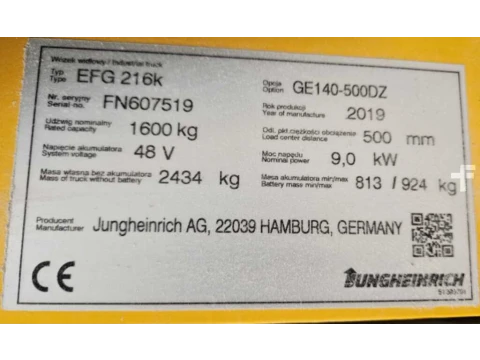 Elektryczne 3-kołowe Jungheinrich EFG216k Triplex Lithium 2019 używane Elektryczny 1600 kg 5000 mm 500 mm 2235 mm 0 h FN607519 ISO Klasse: ISO Klasse 2 = 1.000 - 2.500 kg litowo-jonowy