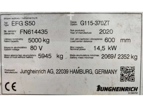 Elektryczne 4-kołowe Jungheinrich EFG S50 2020 używane Elektryczny 5000 kg 3700 mm 600 mm 0 mm 0 h FN614435