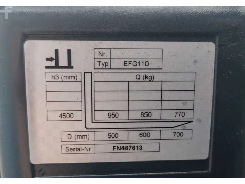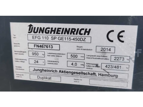 Elektryczne 3-kołowe Jungheinrich EFG 110 4.5m/ 2014y/ 2559mh/ batt2019 2014 używane Elektryczny 1000 kg 4500 mm 0 mm 0 mm 2559 h kwasowo-ołowiowy