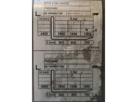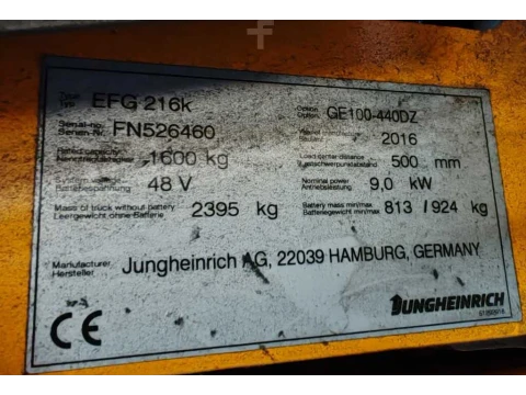 Elektryczne 3-kołowe Jungheinrich EFG 216k 2016 używane Elektryczny 1600 kg 4400 mm 500 mm 2050 mm 6761 h nieznany