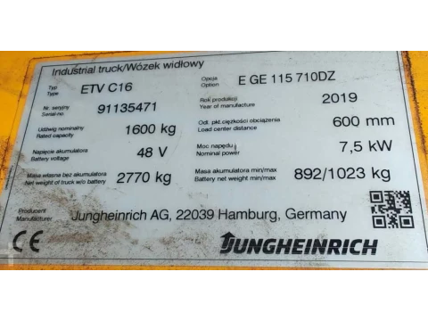 Reach Truck Jungheinrich ETV C16 /3438mh/ 7.1m/ big tires Batt 95% 2019 używane Elektryczny 1600 kg 7100 mm 0 mm 2900 mm 3438 h kwasowo-ołowiowy