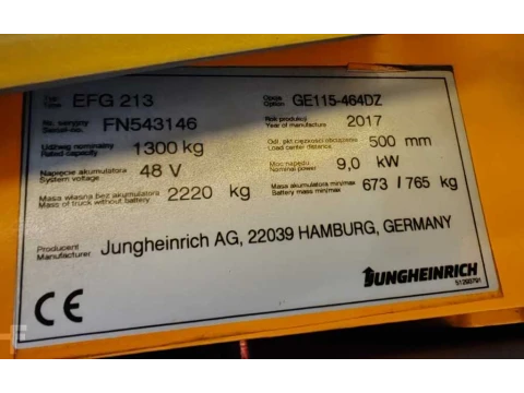 Elektryczne 3-kołowe Jungheinrich EFG 213 / 4.64m/ 2697mh/ 2017yy 2017 używane Elektryczny 1300 kg 4640 mm 500 mm 2100 mm 2697 h nieznany