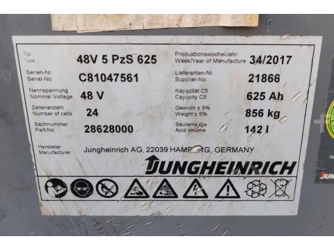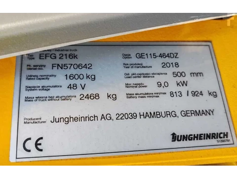 Elektryczne 3-kołowe Jungheinrich EFG 216k 4.64m/ 2018y/ 6630mh 2018 używane Elektryczny 1600 kg 4640 mm 500 mm 0 mm 6630 h kwasowo-ołowiowy