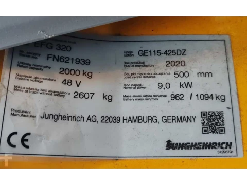 Elektryczne 4-kołowe Jungheinrich EFG 320 li-ion 1449MH!/ 4.25m/ 2020yy 2020 używane Elektryczny 2000 kg 4250 mm 0 mm 1982 mm 1449 h litowo-jonowy