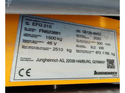 Elektryczne 3-kołowe Jungheinrich EFG 215 / 2020y/ 3589h 2020 używane Elektryczny 1500 kg 4640 mm 0 mm 0 mm 3589 h kwasowo-ołowiowy