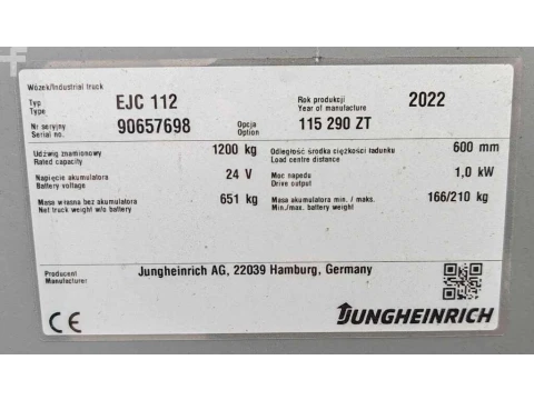 Wózek wysokiego podnoszenia Jungheinrich EJC 112 2022y/ 1064mh/ 2.9m 2022 używane Elektryczny 1200 kg 2900 mm 0 mm 0 mm 1064 h kwasowo-ołowiowy