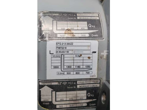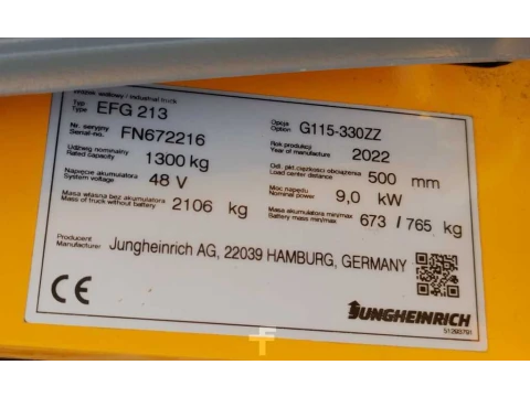 Elektryczne 3-kołowe Jungheinrich EFG 213 LI ION 2022y/ 3.3m/ 6883h/ 4v 2022 używane Elektryczny 1300 kg 3300 mm 0 mm 2160 mm 6883 h FN672216 litowo-jonowy