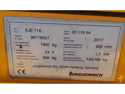 Wózki niskiego podnoszenia Jungheinrich EJE 116 Li-ion 2017 używane Elektryczny 1600 kg 0 mm 0 mm 0 mm 8758 h 98178327 litowo-jonowy
