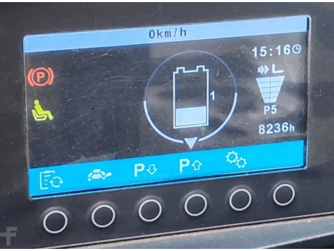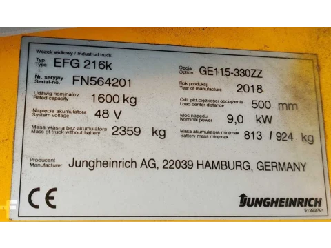 Elektryczne 3-kołowe Jungheinrich EFG 216k Li-ion 2018 używane Elektryczny 1600 kg 3300 mm 0 mm 2160 mm 8236 h FN564201 litowo-jonowy