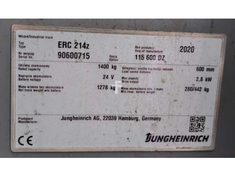 Wózek wysokiego podnoszenia Jungheinrich ERC 214z Li-ION 6m 2020 używane Elektryczny 1400 kg 6000 mm 0 mm 2550 mm 2301 h 90600715 litowo-jonowy